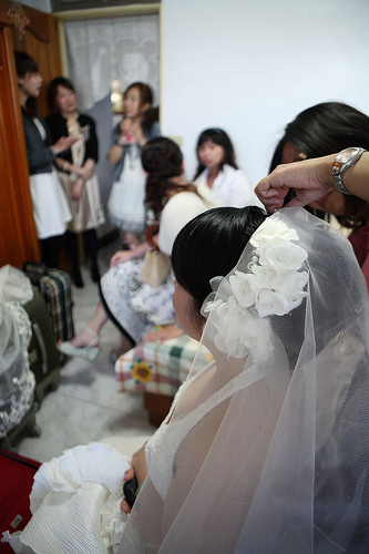 這是當天迎娶測邊的造型 有幾朵小白花點綴 這是到餐廳準備進場時的造型換了一個造型比較誇張的頭紗 效果很讚喔 超級棒的~.